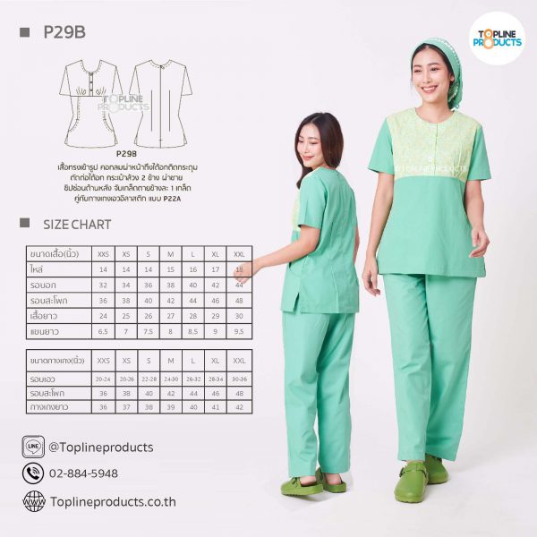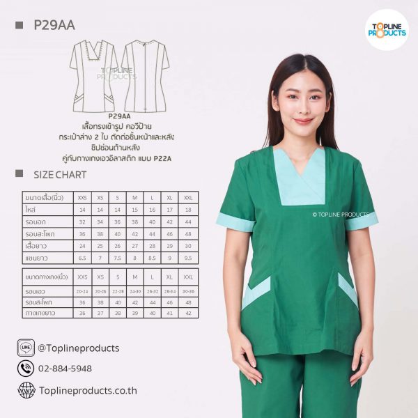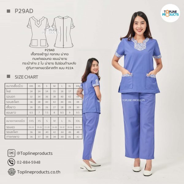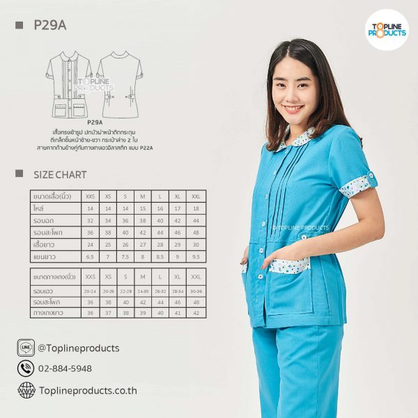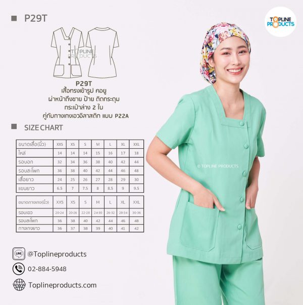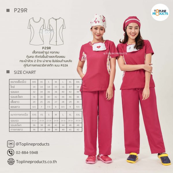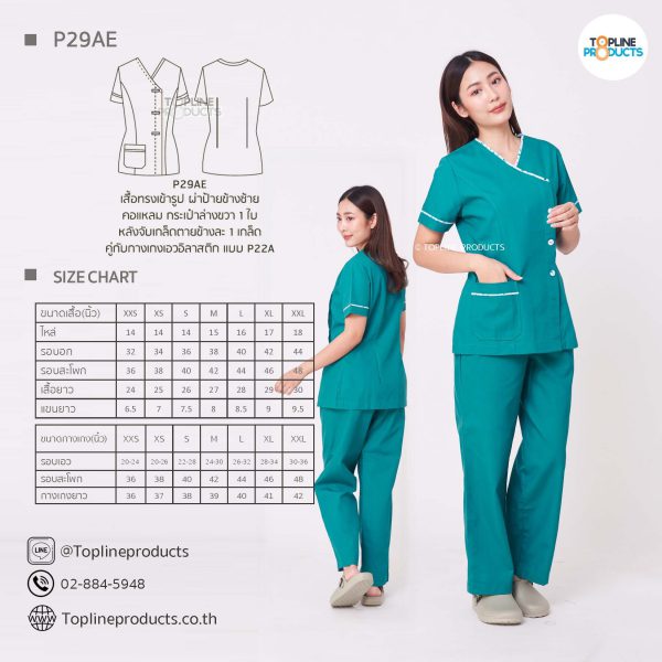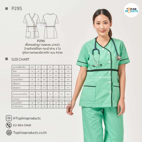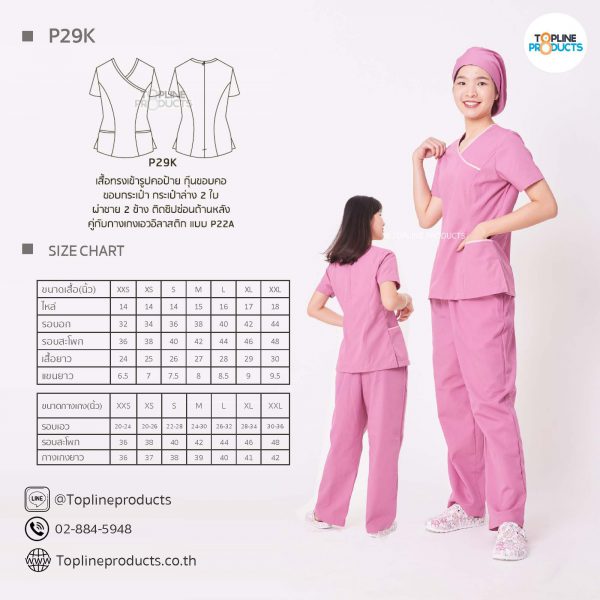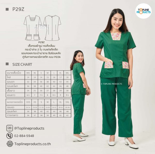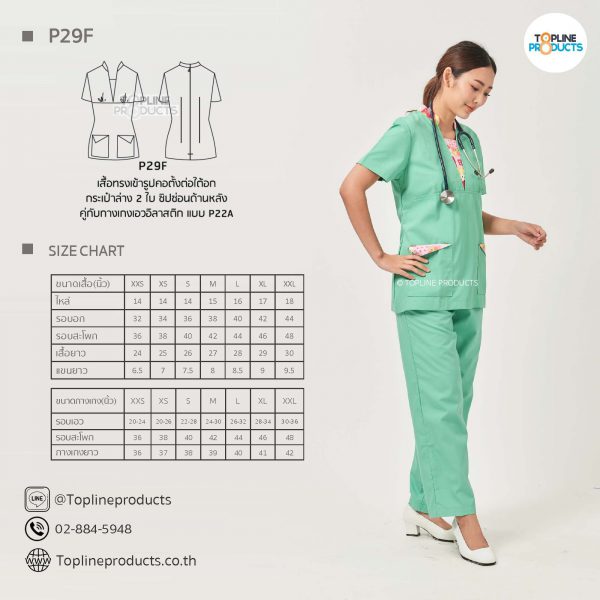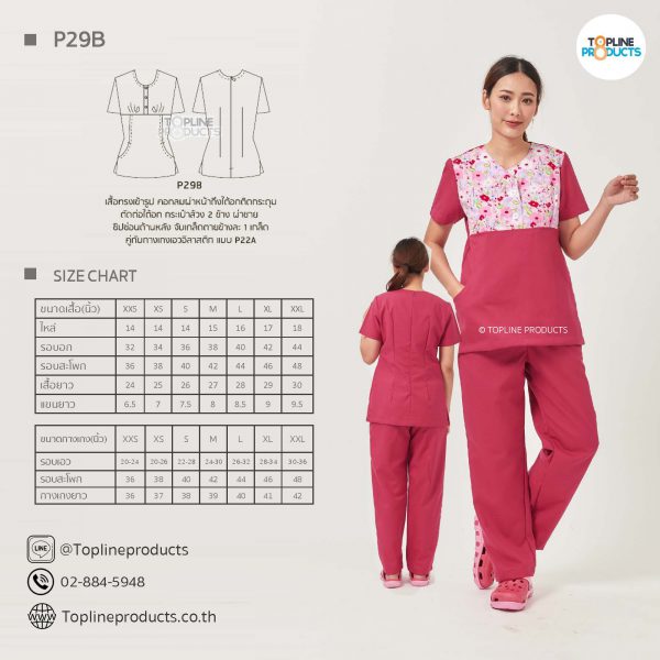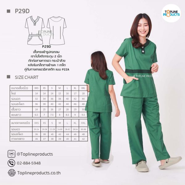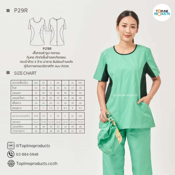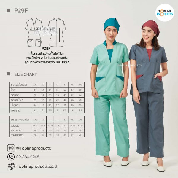 ชุดสครับเสื้อทรงเข้ารูปแบบต่างๆ มีให้เลือกทั้งหมด 31 แบบ (P29A – P29AE) เสื้อเป็นทรงเข้ารูป ในรูปเป็นเพียงแนวทางการเล่นสี สามารถสั่งผลิตเลือกสีได้ตามที่ต้องการ โดยไม่มีจำนวนขั้นต่ำ