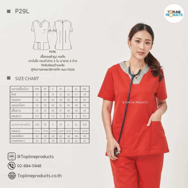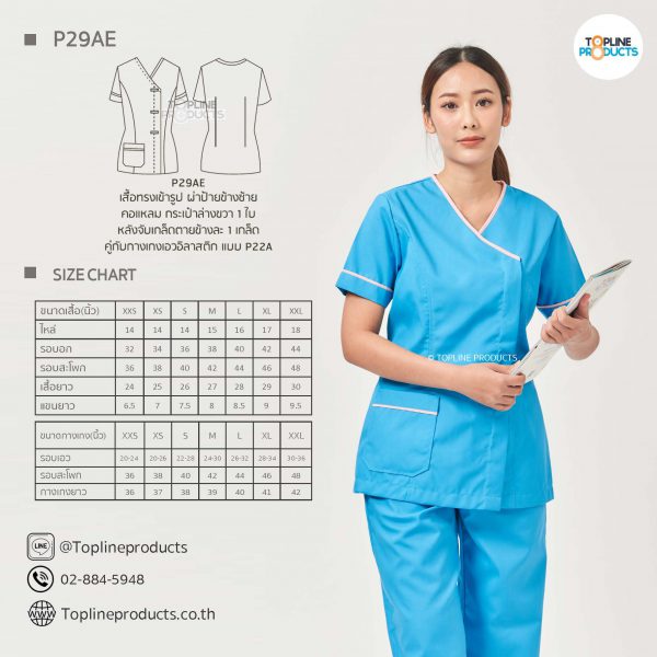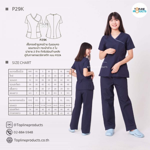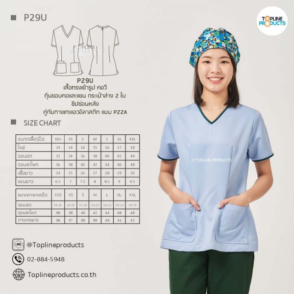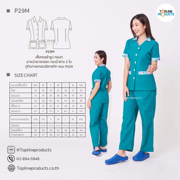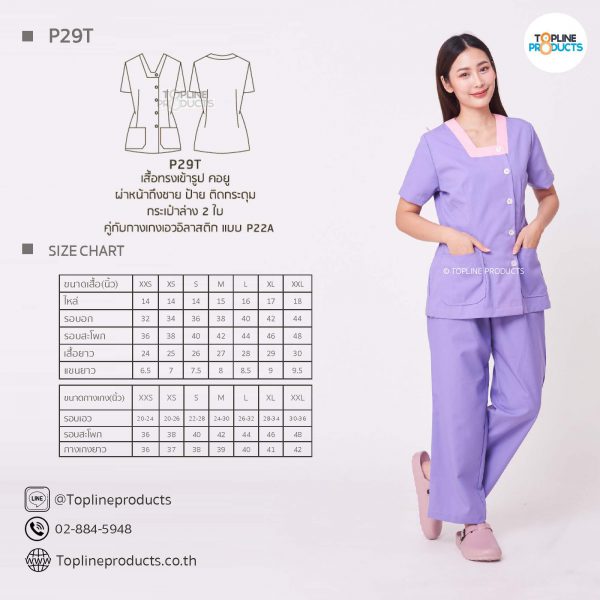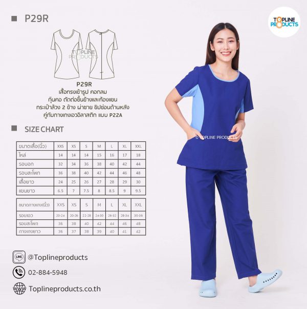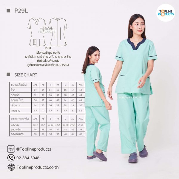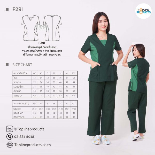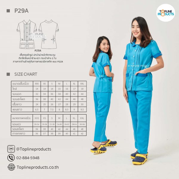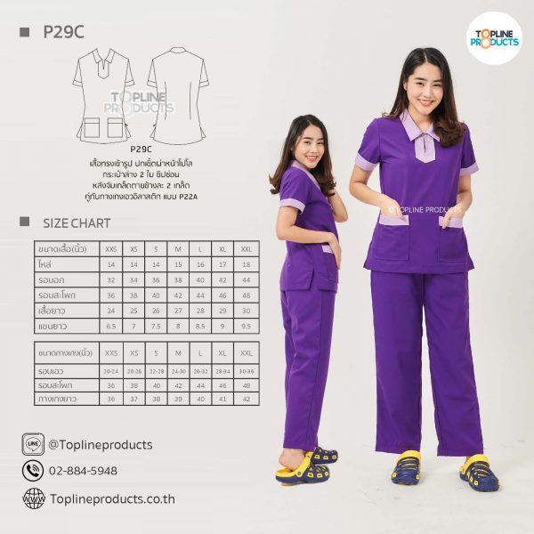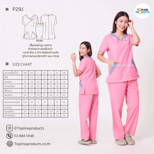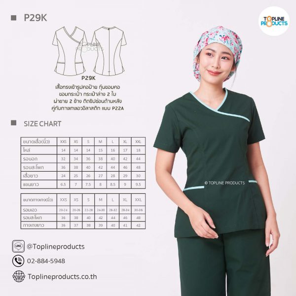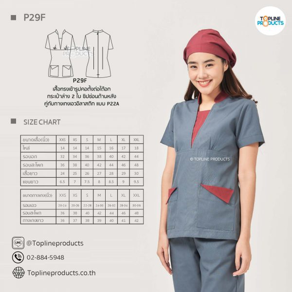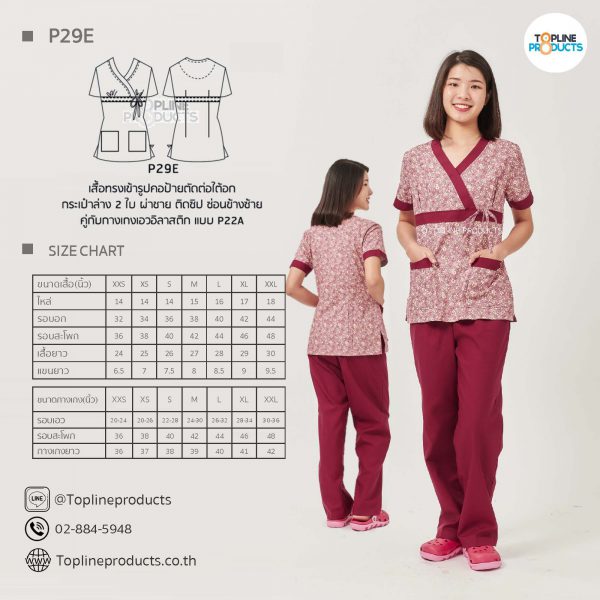 ชุดสครับเสื้อทรงเข้ารูปแบบต่างๆ มีให้เลือกทั้งหมด 31 แบบ (P29A – P29AE) เสื้อเป็นทรงเข้ารูป ในรูปเป็นเพียงแนวทางการเล่นสี สามารถสั่งผลิตเลือกสีได้ตามที่ต้องการ โดยไม่มีจำนวนขั้นต่ำ