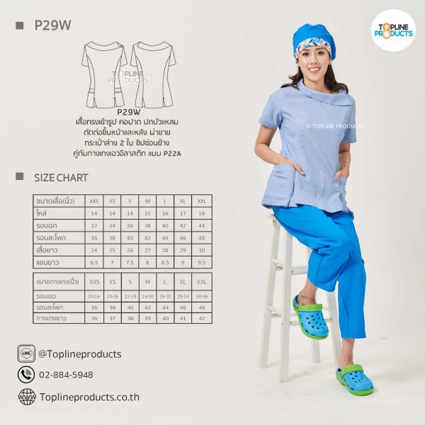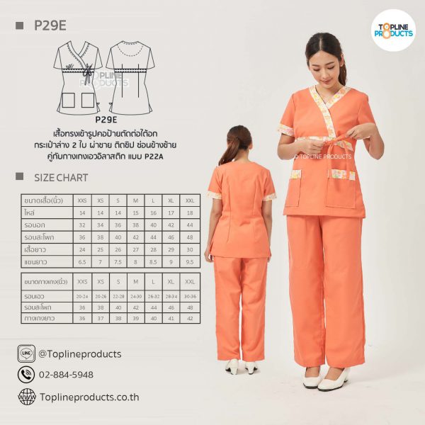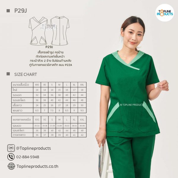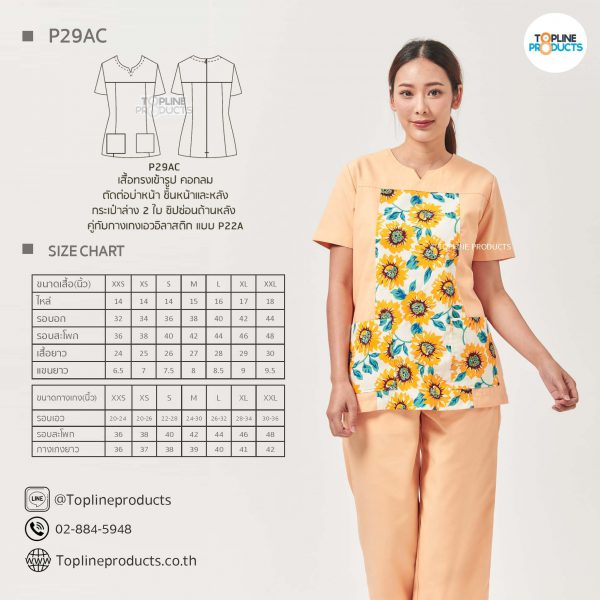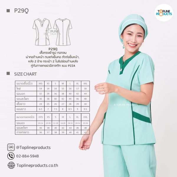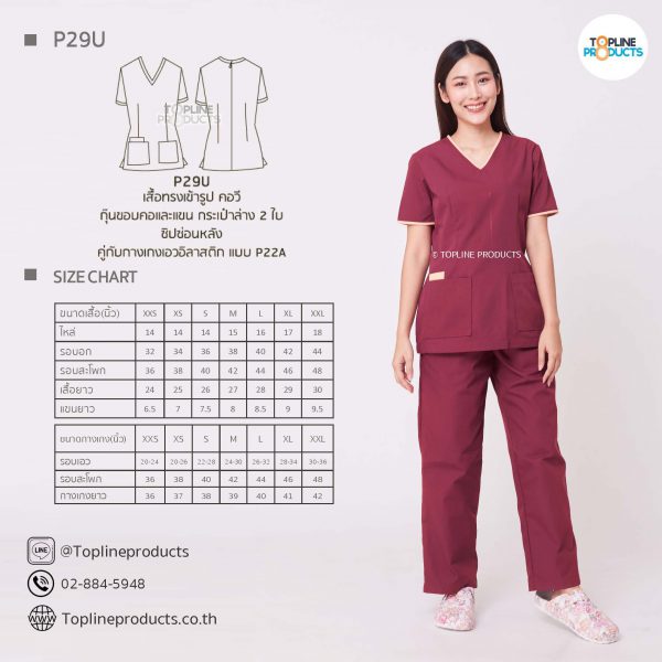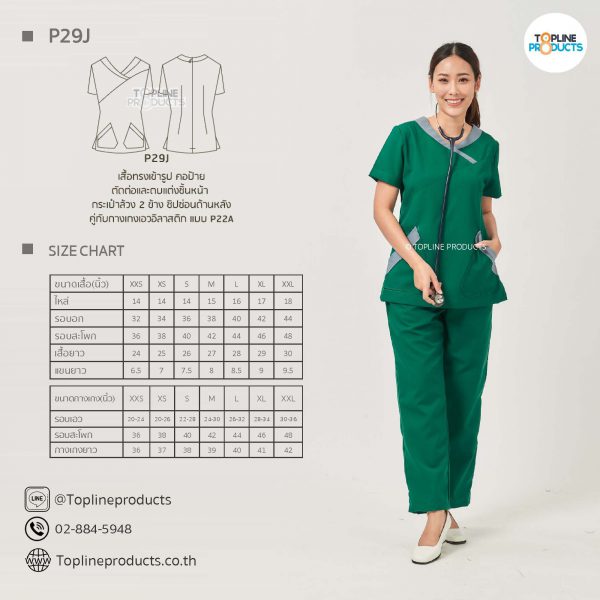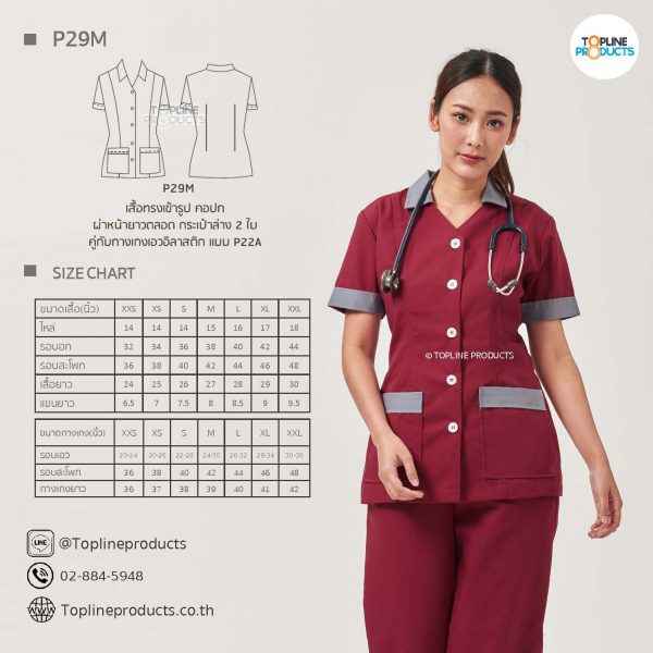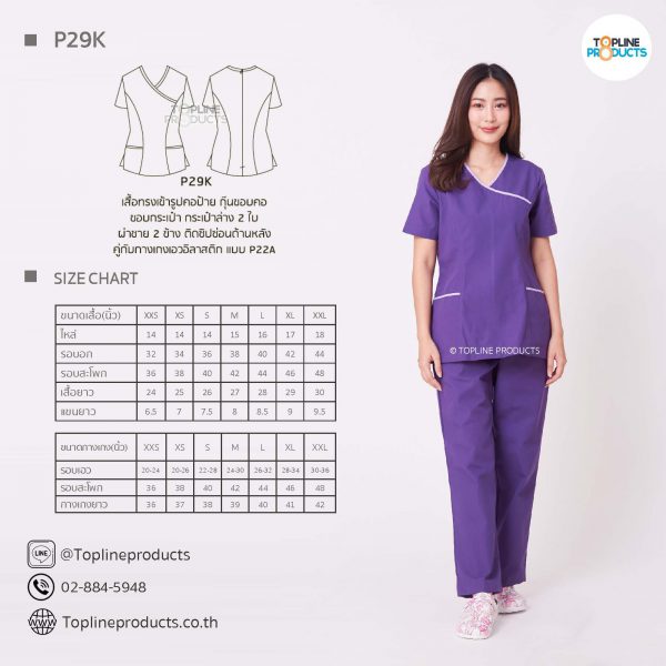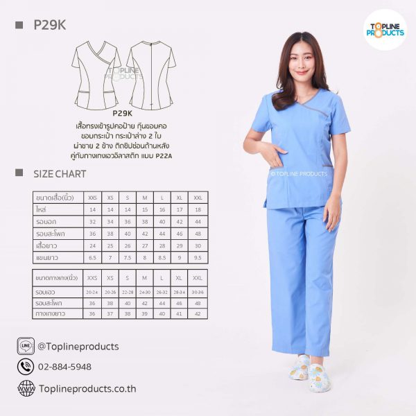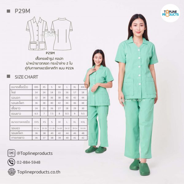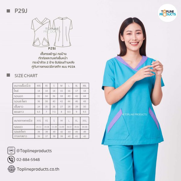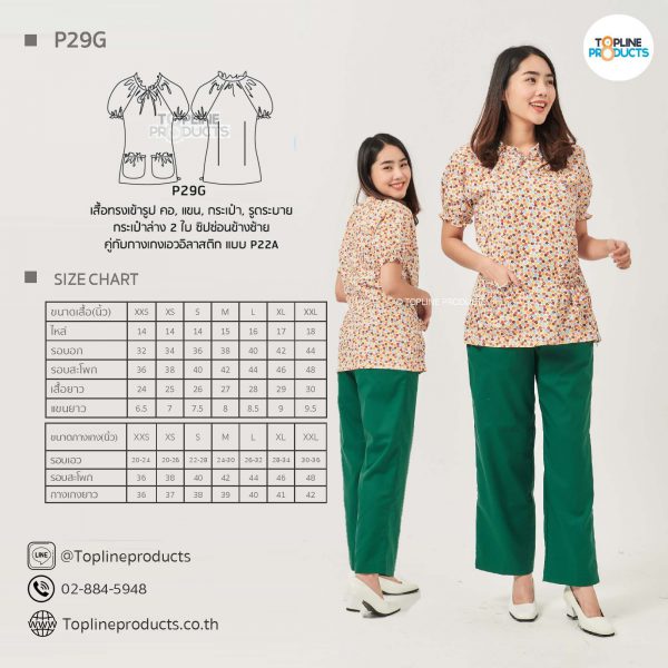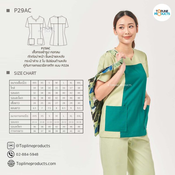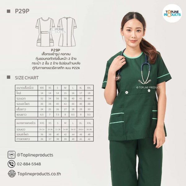 ชุดสครับเสื้อทรงเข้ารูปแบบต่างๆ มีให้เลือกทั้งหมด 31 แบบ (P29A – P29AE) เสื้อเป็นทรงเข้ารูป ในรูปเป็นเพียงแนวทางการเล่นสี สามารถสั่งผลิตเลือกสีได้ตามที่ต้องการ โดยไม่มีจำนวนขั้นต่ำ