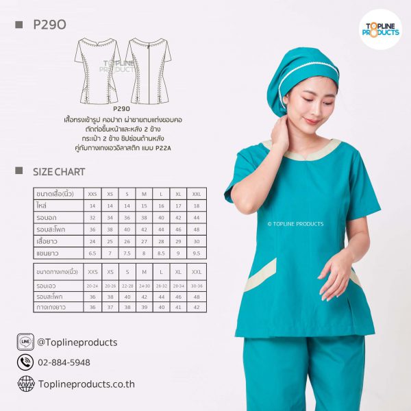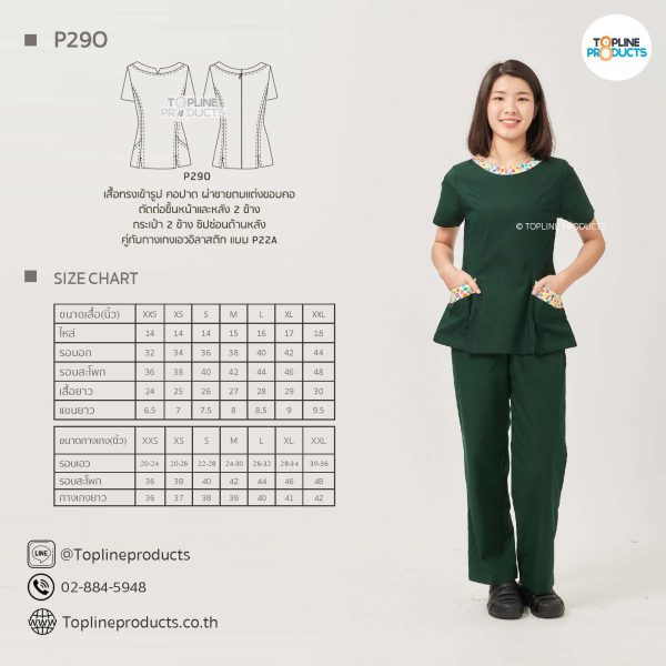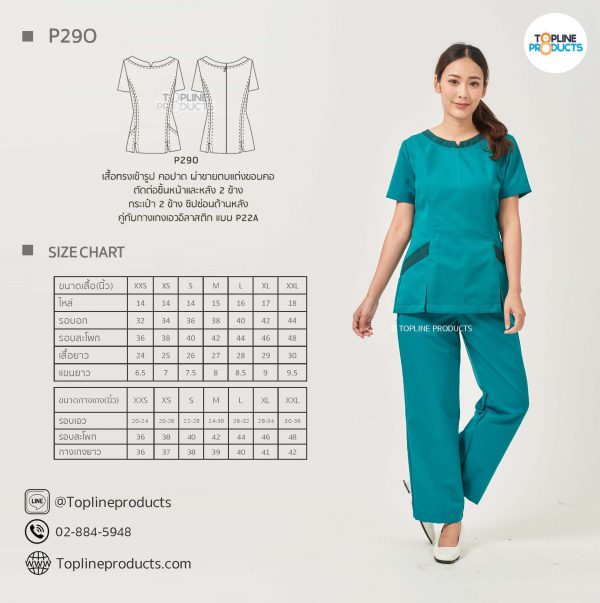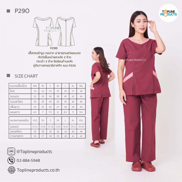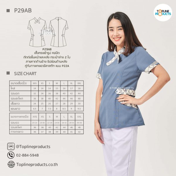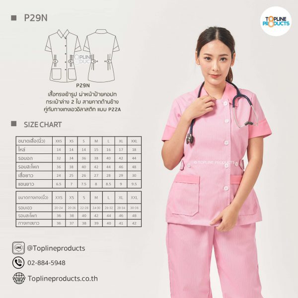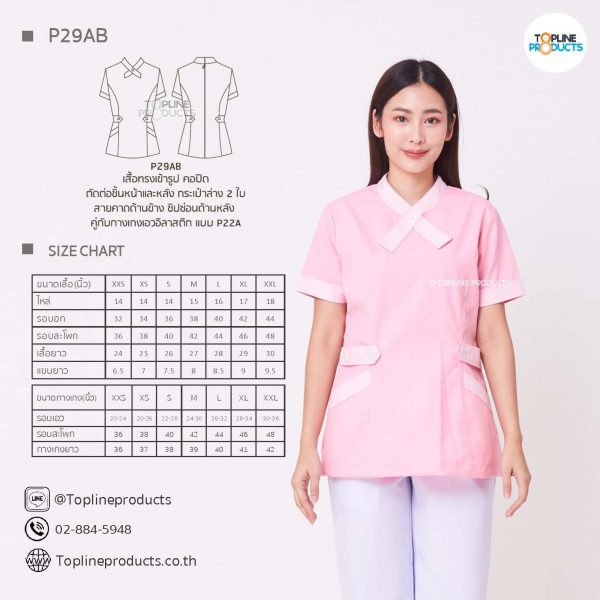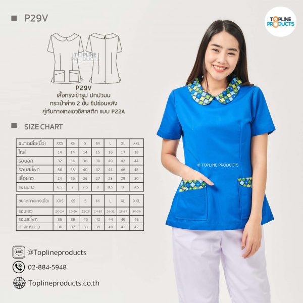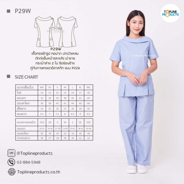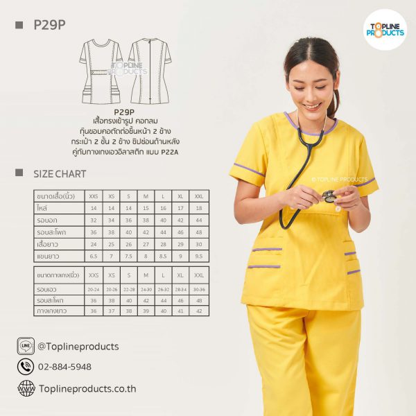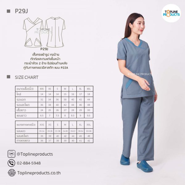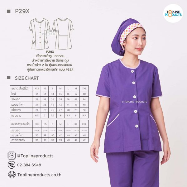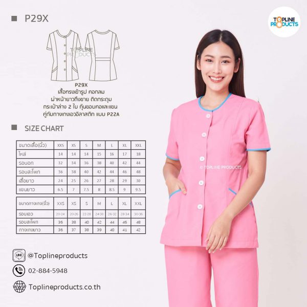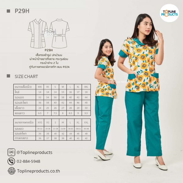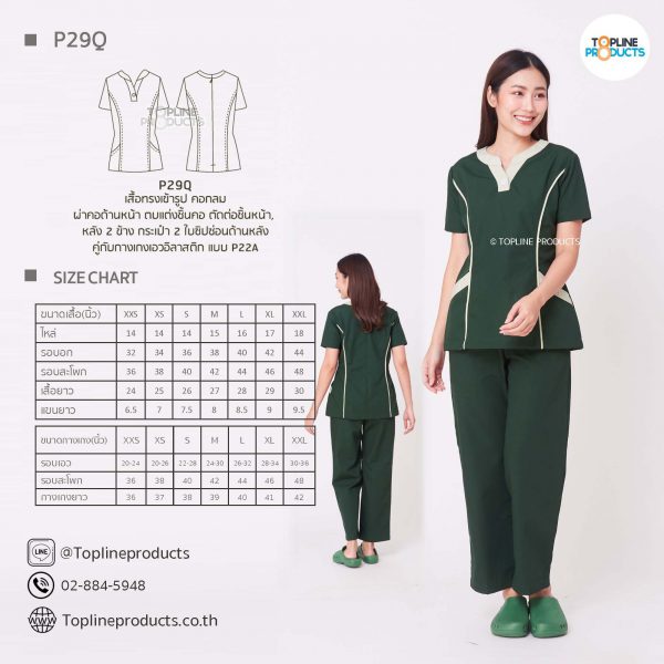ชุดสครับเสื้อทรงเข้ารูปแบบต่างๆ มีให้เลือกทั้งหมด 31 แบบ (P29A – P29AE) เสื้อเป็นทรงเข้ารูป ในรูปเป็นเพียงแนวทางการเล่นสี สามารถสั่งผลิตเลือกสีได้ตามที่ต้องการ โดยไม่มีจำนวนขั้นต่ำ