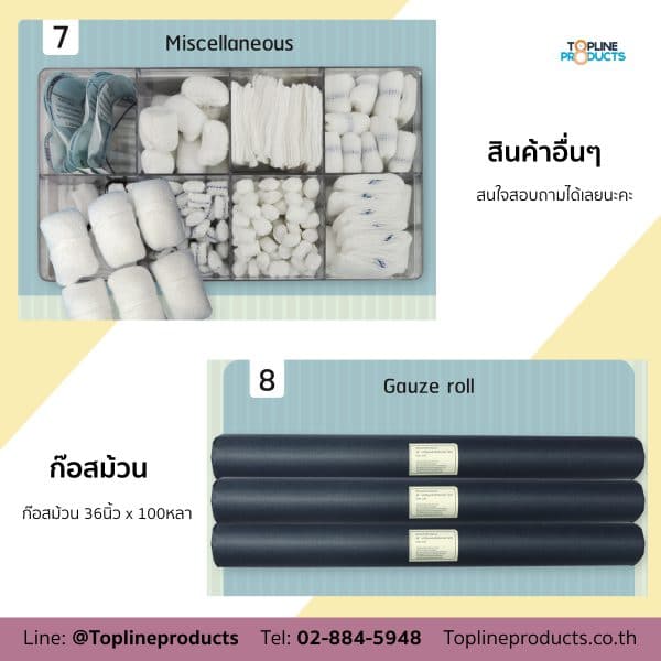 - ก๊อสเดรน 0.5 ซม. x 3 หลา, 1 ซม. x 3 หลา, 1 นิ้ว x 3 หลา, 1.5 นิ้ว x 3 หลา